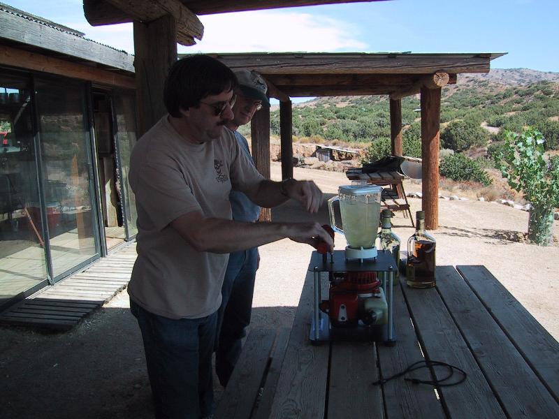 Ed Hackett showing how one rides the two-stroke blender, as Roland looks on.