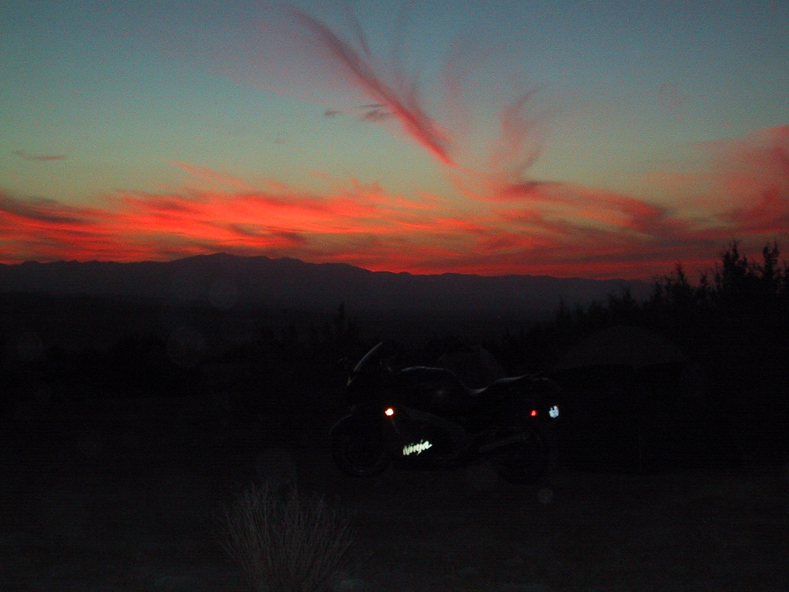 Sunset Saturday evening #4 - (with flash - which, for some reason, doesn't help much with sunset pics), looking at the sunset with my bike & tent in the foreground.