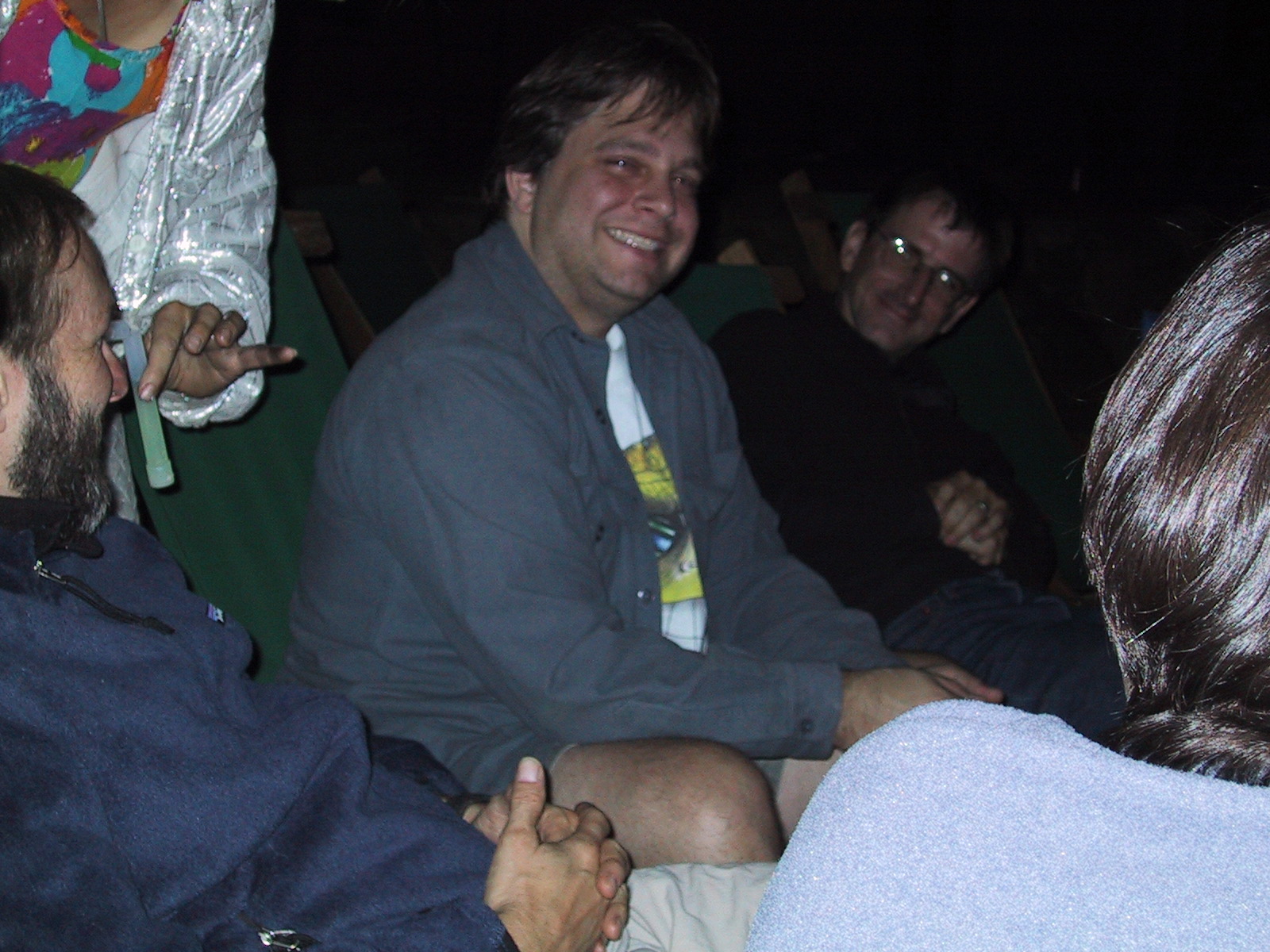 Lissa (background on left) is about to pantomime putting (supposedly NON-toxic, according to the label) glow-stick contents into Jim Franklin's hair for about the next 15 minutes, which he is evidently quite pleased about (as Doug Merriman on left and Dave Doudna on right look on). Jim stayed in town a couple of extra weeks before moving back to the east coast just so he could attend this Joust and be abused some more.